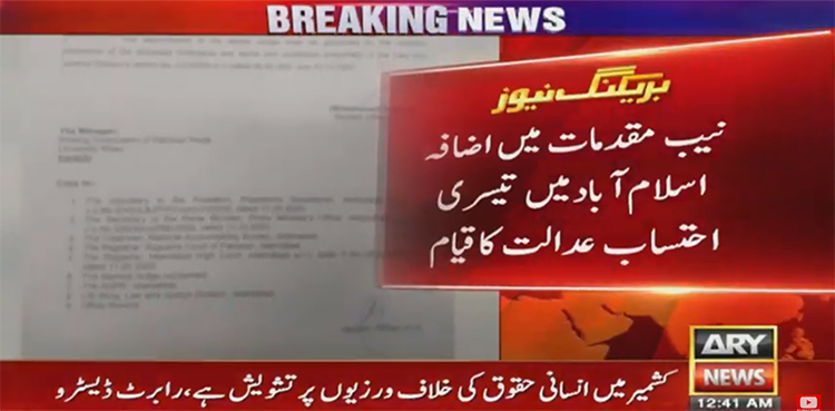 ISLAMABAD: A third accountability court is being established in Islamabad to deal with the rising alleged corruption cases filed from the National Accountability Bureau (NAB), ARY NEWS reported.
