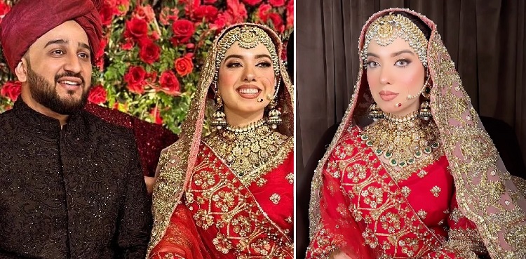 In the visuals from the night, shared by her showbiz fellows on social media, the bride looked regal in her red and gold ensemble by Pakistani couturier Ali Xeeshan, with matching jewels and hair & makeup by celebrity artist, Allure Salon.