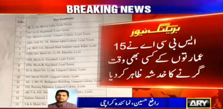 KARAC HI: The Sindh Building Control Authority (SBCA) on Wednesday warned that at least 15 hazardous buildings may fall anytime in Karachi’s Lyari, ARY News reported.