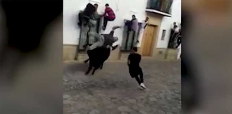 More than a dozen locals eventually managed to carry the man to safety after the bull is lured away down the street.