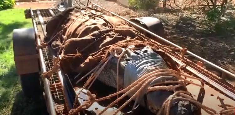 It can be seen in the pictures and video that crocodile is tied down, blindfolded and blanketed on an extended car trailer.