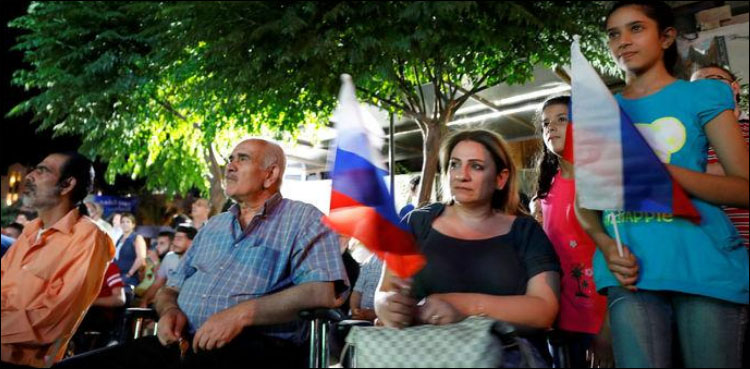 Russian flags were being waved by fans watching Tuesday’s match at an open-air screen in a street in Damascus, where just last month the government and its allies crushed the last remaining rebel enclave.
