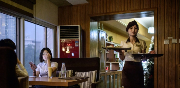 The 1970s-style decor is predominantly brown, pictures of the Kimilsungia and Kimjongilia flowers named for the North’s rulers are on show, and footage of the State Merited Chorus plays on a television.