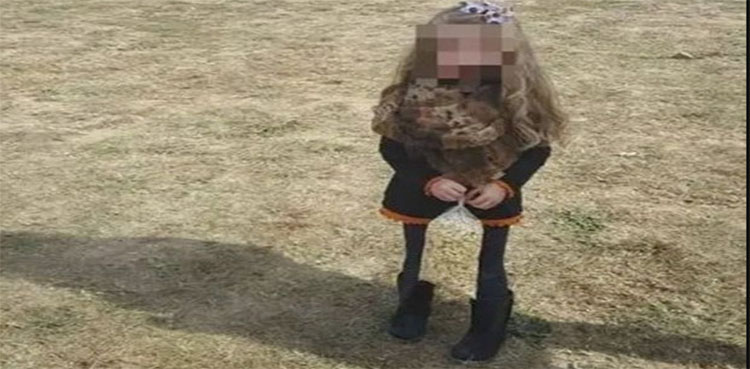 The picture shows a small child in a park with a cute clip in her hair and a cosy scarf on but her legs look very odd.