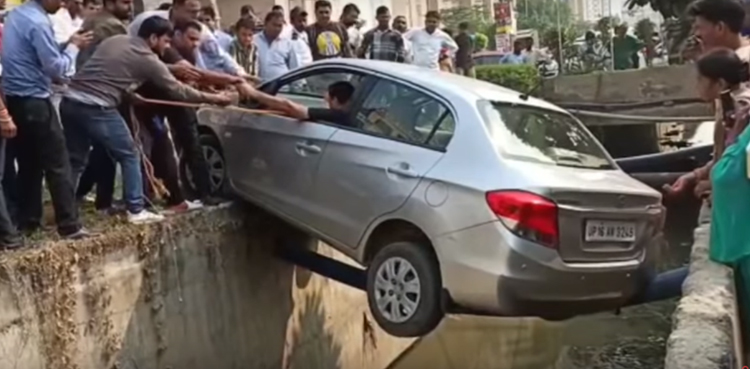 A man in India was rescued from a car hanging over a sewerage line.
