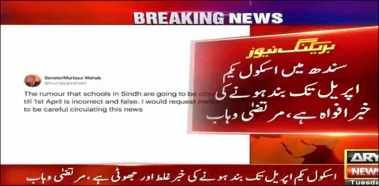 KARACHI: Sindh government’s spokesperson Murtaza Wahab has rebutted the rumours of closure of schools till April 1 in Sindh, ARY News reported on Tuesday.