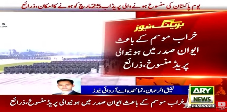 ISLAMABAD: The Pakistan Day military parade scheduled to be held today (Thursday) has been postponed due to weather conditions, ARY News reported, quoting Aiwan-e-Saddar.