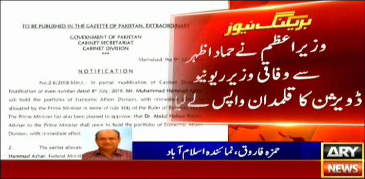 ISLAMABAD: The prime minister has changed the portfolio of Revenue Division Minister Hammad Azhar, ARY News reported on Wednesday.