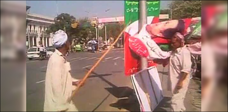 Banner and posters displayed throughout the city including Mall road and Jail Road were taken down before PTI’s rally on 29th.