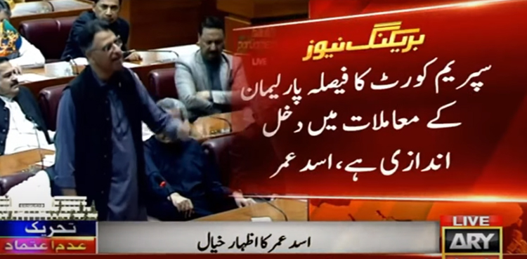 ISLAMABAD: Pakistan Tehreek-e-Insaf (PTI) MNA Asad Umar on Saturday termed the Supreme Court decision against NA Speaker’s April 3 ruling “interference in parliamentary affairs” as the govt filed a review petition against the verdict, ARY News reported.