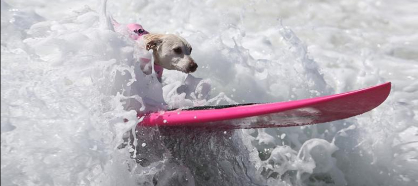 Dogs and their owners came from as far away as Australia and Brazil to compete in California on Sunday, with more than 2,000 spectators, as the pets wore lifejackets and tried to avoid wiping out in the unusually high waves.