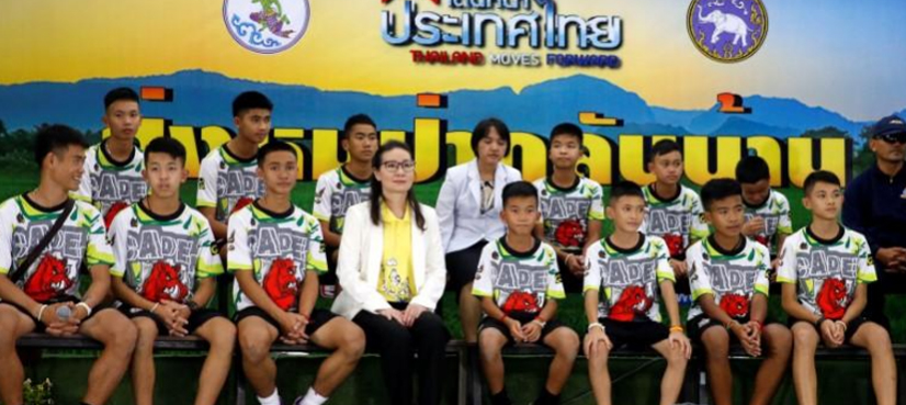 “Bringing the Wild Boars Home”, read a banner in Thai welcoming them on the set, designed to resemble a soccer pitch, complete with goalposts and nets.