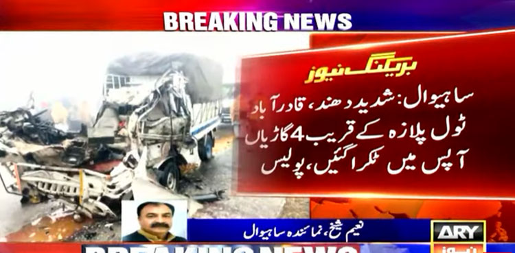 SAHIWAL: Poor visibility led to the collision of 4 cars near Qadiurabad Toll Plaza in Sahiwal, killing three people and injuring five others, ARY News reported.