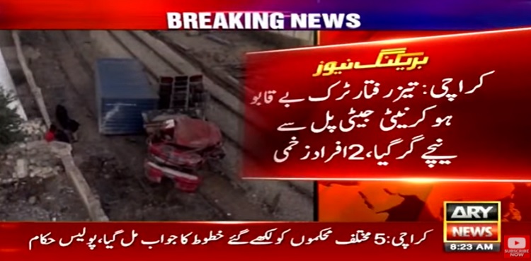 KARACHI: Two persons sustained severe wounds after a speeding truck fell from Native Jetty Bridge early on Tuesday morning.