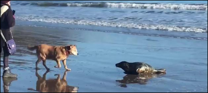 The video shows a seal coming up onto the sand, where it ends up coming face-to-face with Lula.