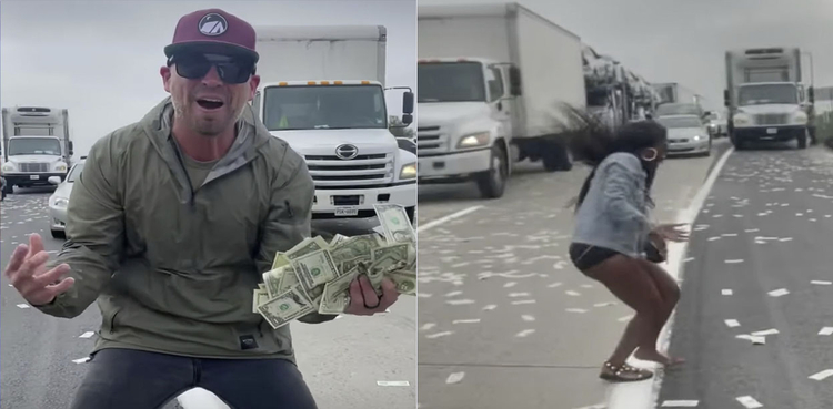 Videos on social media showed an influencer going live and with cash bills in her hands as vehicles stopped on the freeway picking up cash.